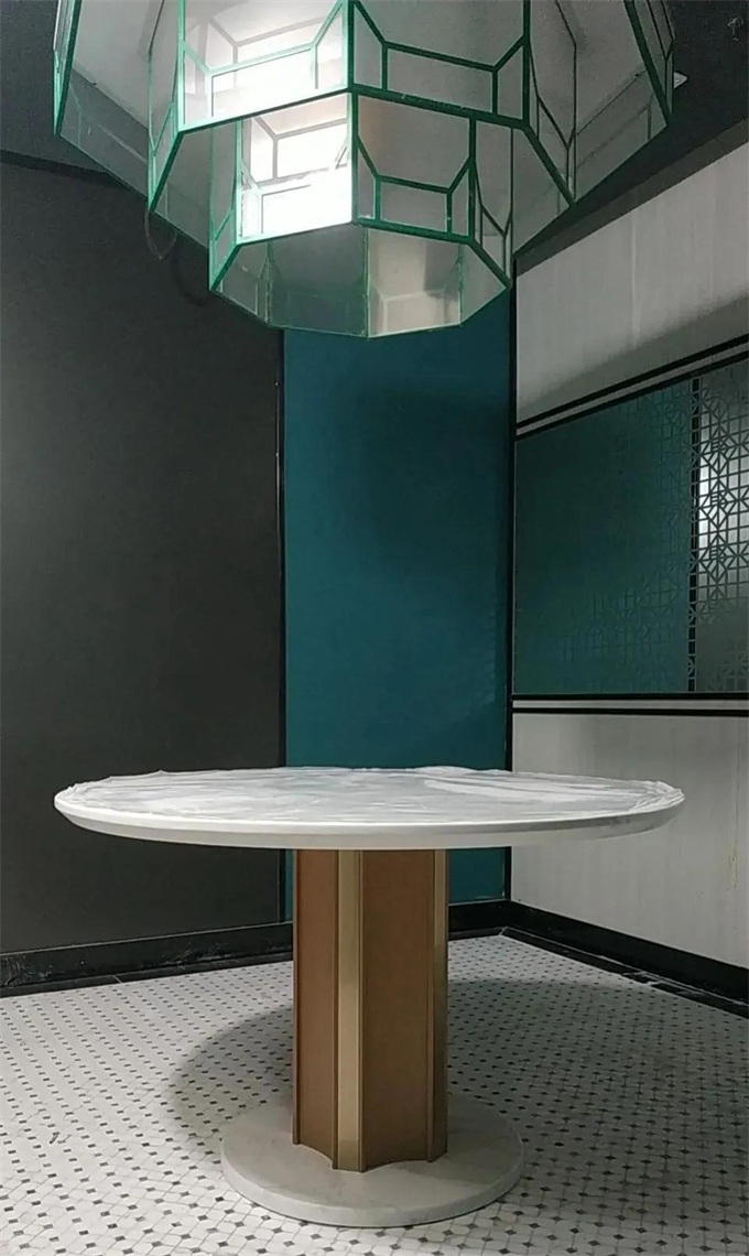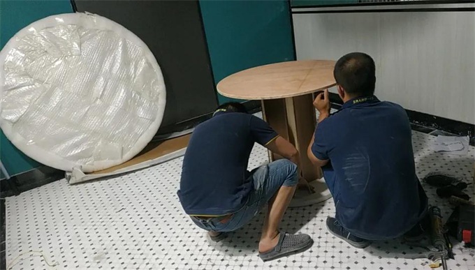 當我們把超直徑1800mm的大理石臺面從一樓搬到二樓,動用了7個人,才順利完成任務。又是一天辛苦勞作,終于把所有桌子安裝好,并把所有家具擺放到位,等待客戶的檢測。